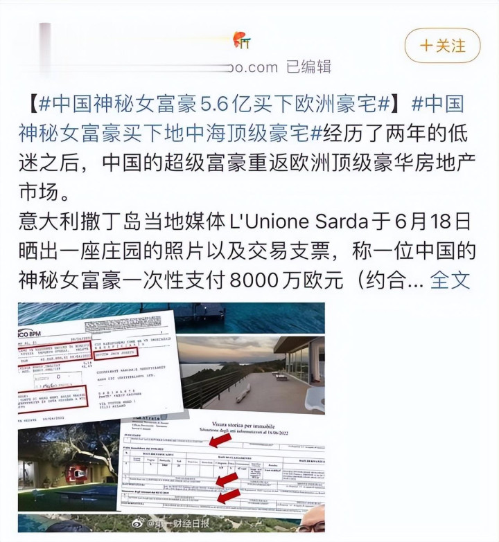 在2022年,一位名叫王娜妮的中国女富豪,一次性付清8500万欧元,买下意大利撒丁岛的一座岛上别墅。